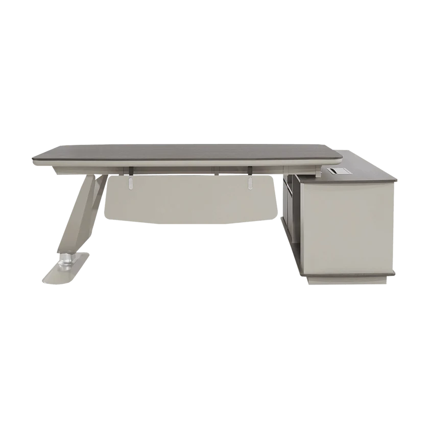• Storage: Integrated side cabinet with drawers and concealed wire port.