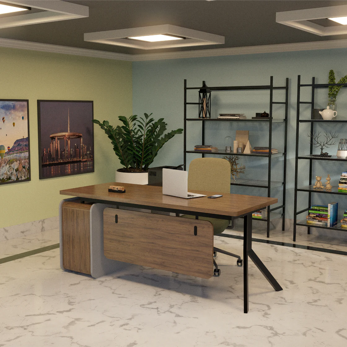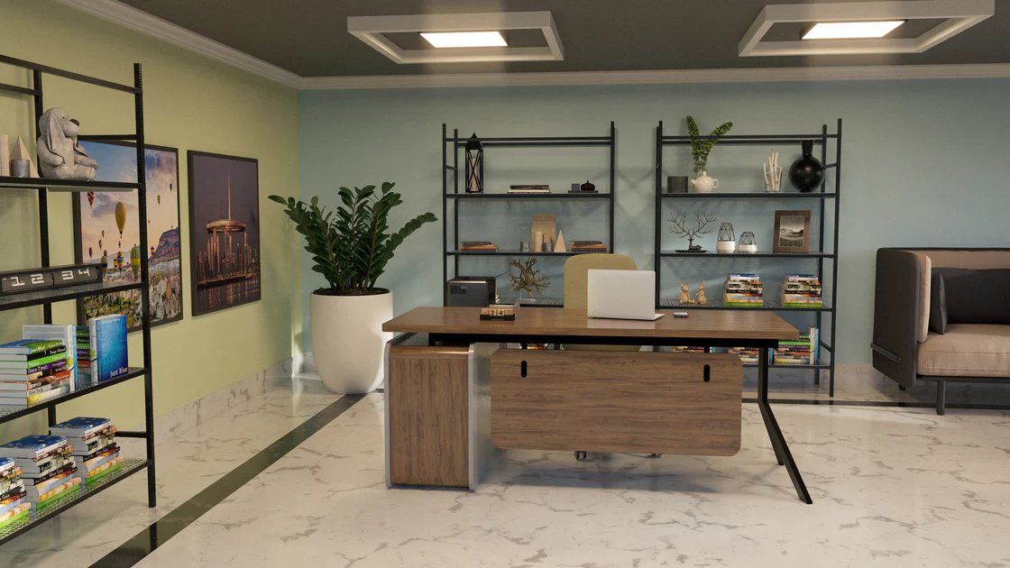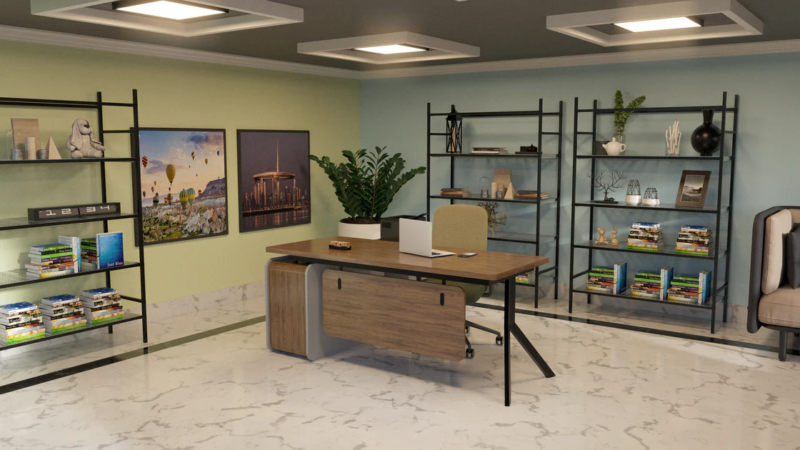 Axis Desk Product Description:Material: Laminated MFC / Laminated MDF18-Gauge MS Powder Coated Metal FrameSize: 5.6′ by 2.6’Color CustomizationDrawer for Extra Storage